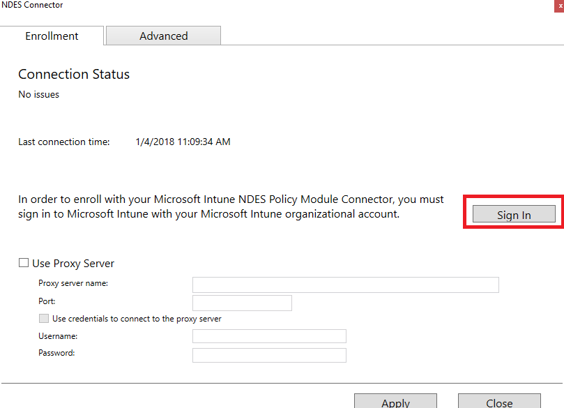 At this point you might have noticed that so far, our actions were not related to Microsoft Intune and we have done everything on our on-premise servers. With this complete, now it’s time to connect our on-premise service to the Microsoft Intune cloud. The interface between Intune and your NDES computer is the Intune Connector which we will install now.