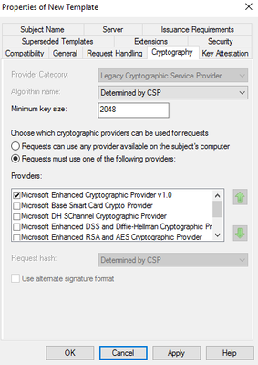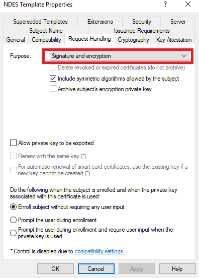 Now the question is ‘How does the NDES server know which certificate template to request from the CA?’ The first step is to identify the purpose of the template that you just created which can be checked on the Request Handling tab: