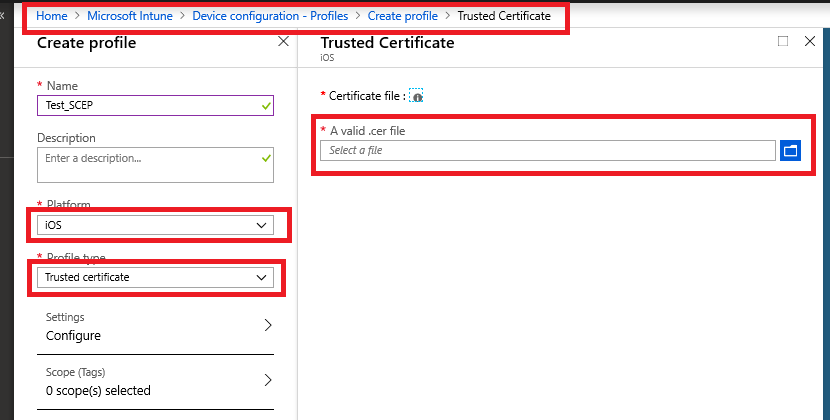Next, logon to your Intune portal and create a trusted certificate profile first. In my example I created a profile for iOS devices: