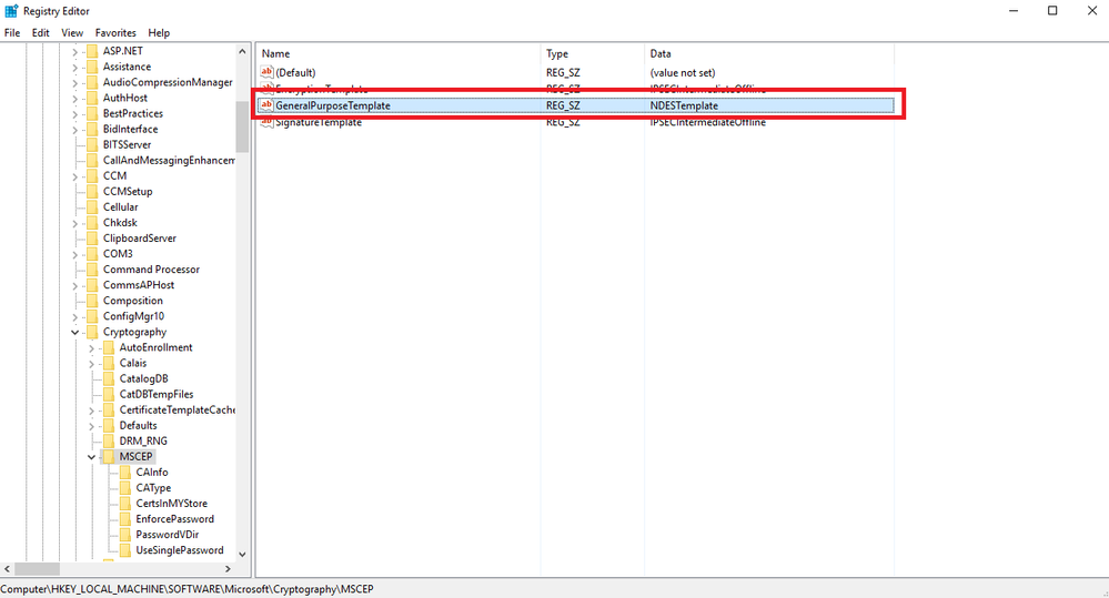 In our example, the purpose is Signature and encryption. We need to map this information to the registry keys on the NDES computer. To do this, logon to your NDES computer, run regedit and navigate to HKLM\Software\Microsoft\Cryptography\MSCEP. You will see 3 registry entries: