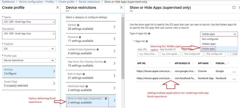 In this scenario, the device would only have the two applications visible and others such as the built-in apps Contacts/Camera/Appstore will be hidden from the user, giving you an experience similar to that of multi-app kiosk mode. Just be aware that as with single app kiosk mode for iOS, this setting is only available for supervised devices enrolled in Intune using DEP.