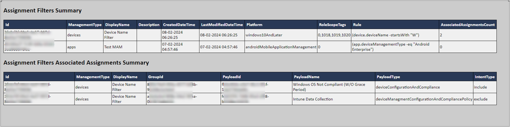 The report will have a summary table of all assignment filters in the tenant with filter type, platform, rule, and associated assignments count along with a few other common fields. A second table will list all associated assignments details for each filter with payload id, payload name, payload type and intent.