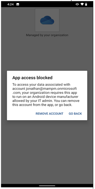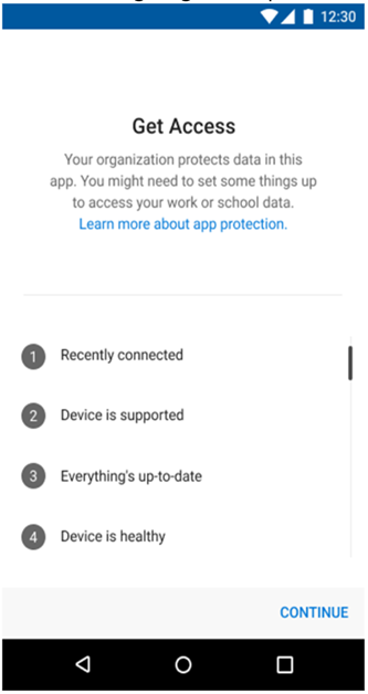 We have also updated the experience if Conditional Launch is configured such that users should receive a warning, be blocked from accessing the app, have the app’s work or school account data wiped, or if the app does not meet the compliance requirements. With this new release, users may tap “Continue” in the new “Get Access” screen to view the reason they are not in compliance and the recommended remediation steps.