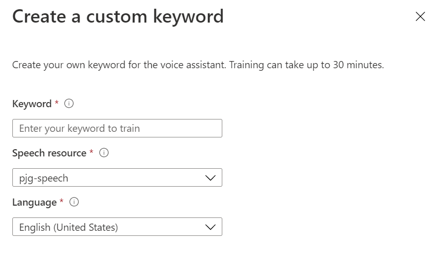 Here we can enter the keyword of our choosing, select an Azure Speech Resource and a Language, and pressing save will begin the training process.