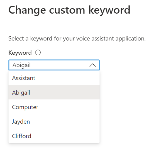 Once the training is complete, a process which took my chosen keyword of Clifford (my co host on IoTeaLive!) only a few moments, we’re then able to hit the “Change” button next to the Custom Keyword and select our new Keyword from the list;