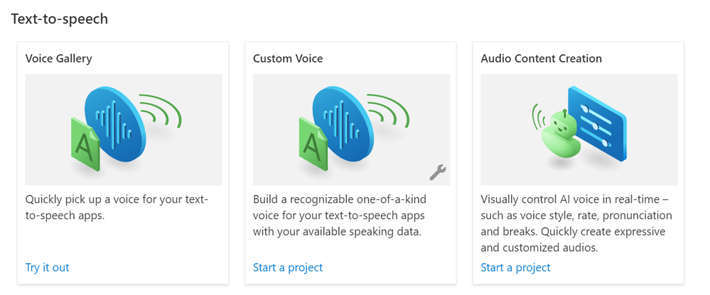We then have “Text-to-speech” which has Voice Gallery, Custom Voice, Audio Content Creation;