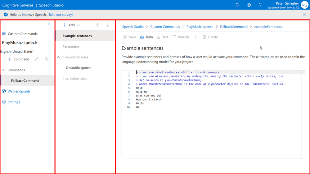 In the centre pane, we have a contextual area, primarily this is where we can select to configure the Example Sentences for our commands, create or edit Parameters, configure Completion Rules and create and configure Interaction Rules.