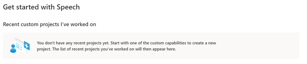 At the top of the page should be listed our existing Speech Projects. However, there appears to be an issue with Speech Studio at the time of writing, which means our projects aren’t listed sadly.