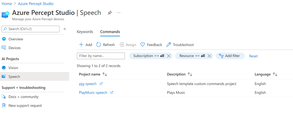 You should see at least two Speech Projects listed there. In my case, the first is the project associated with Sample we spun up in the previous post, the second is the new Custom Command we just created above.