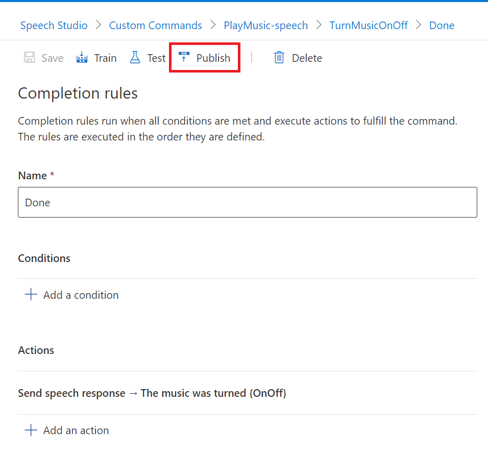 Clicking on the Custom Command Speech Project we want to work with, in our case the “PlayMusic-speech” project, takes us to Speech Studio;