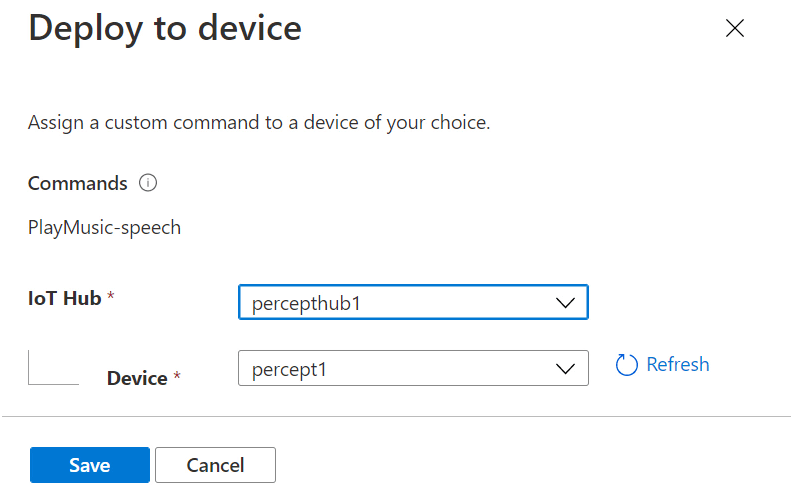 We’ll then be shown the “Deploy to device” dialog, where we can select the IoT Hub and Percept device we want to deploy our new command to;