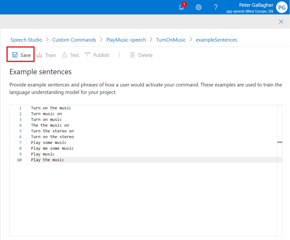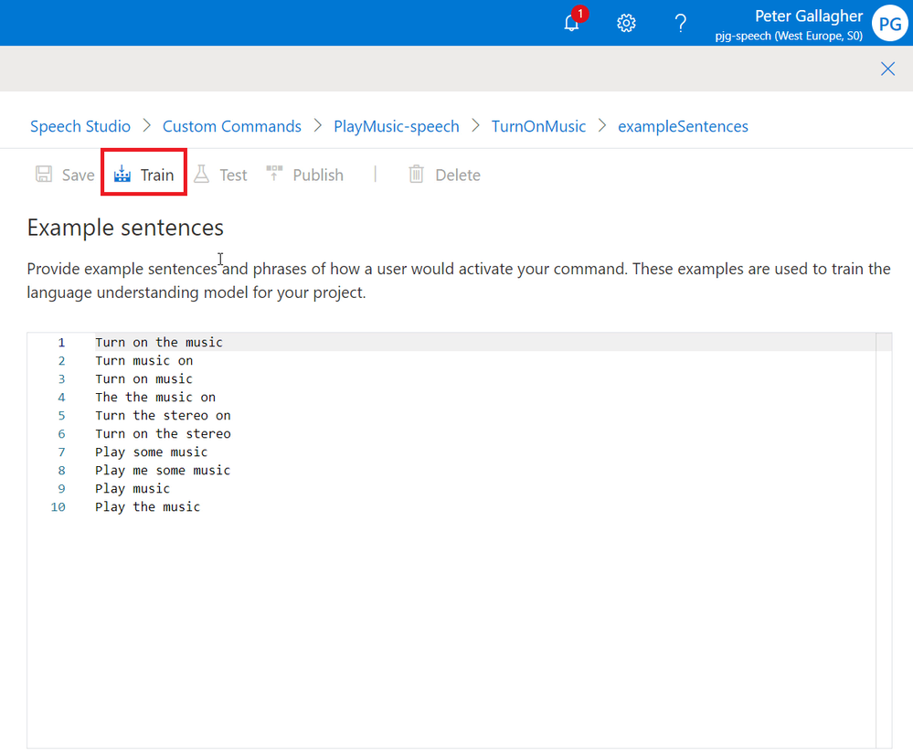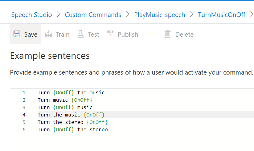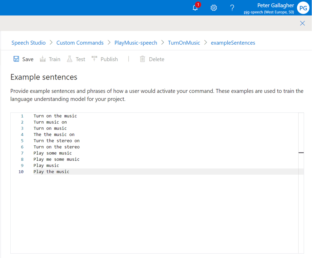 If we navigate back to the Example Sentences page, we can get ready to test our Custom Command.