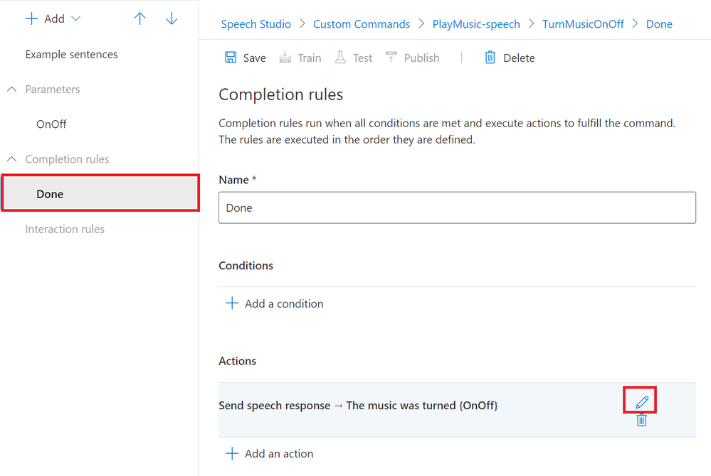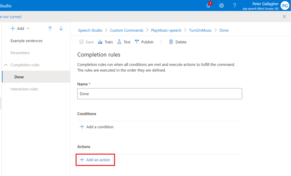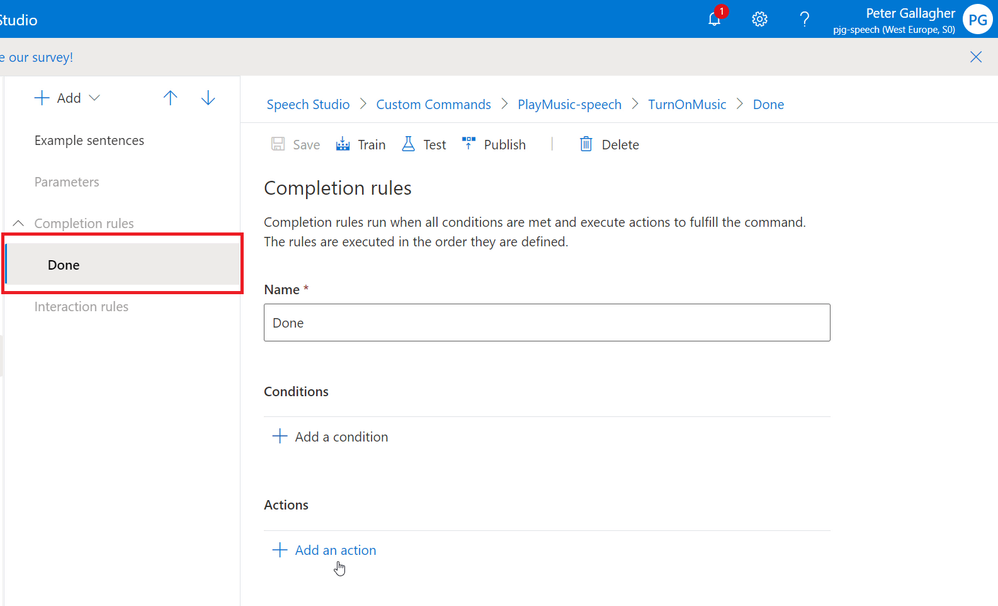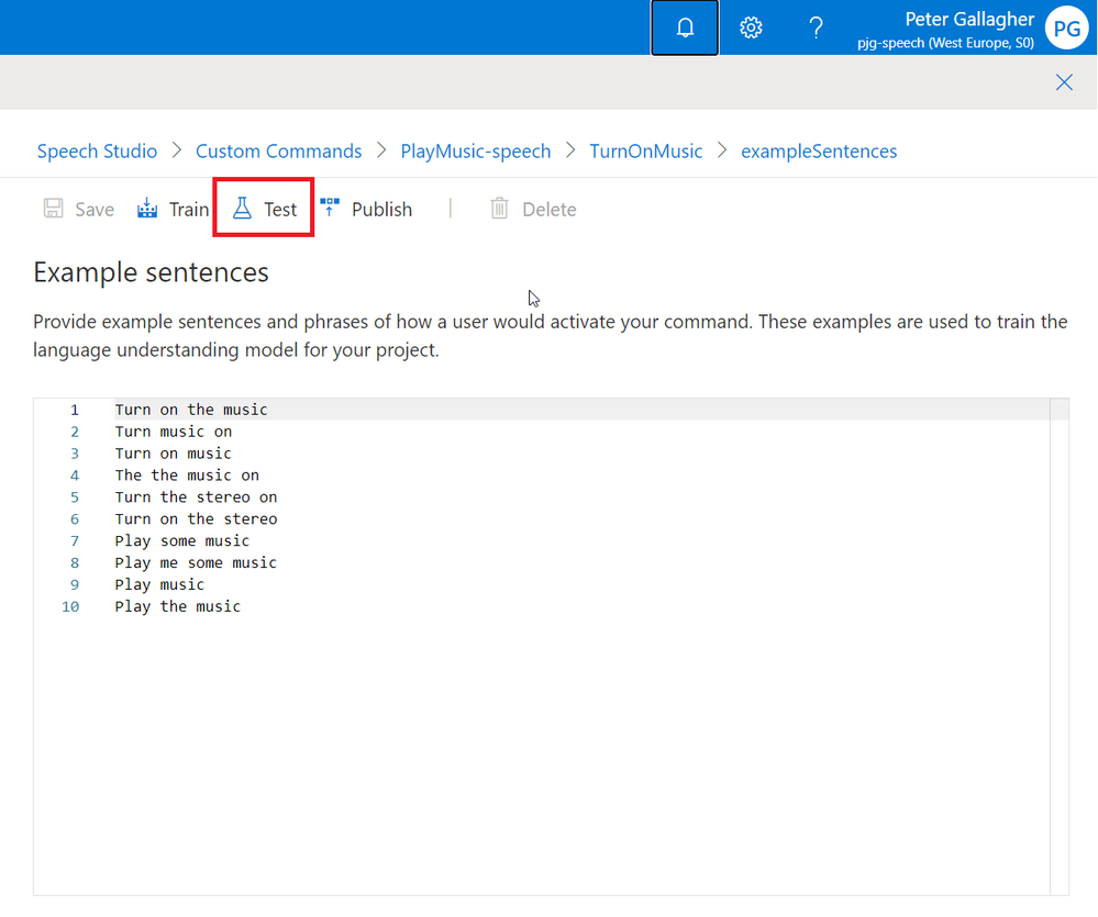 Now that we have the basics of a Custom Command, we can go ahead and test it using the in built test functionality within Speech Studio.