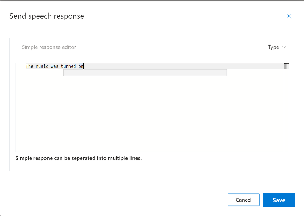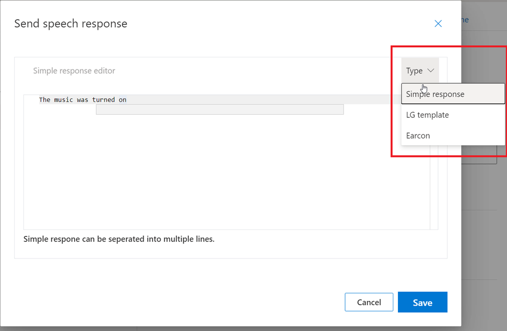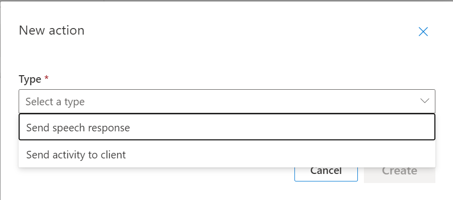 Selecting “Send speech response” and hitting the “Create” button will pop up the “Send speech response” editor window.