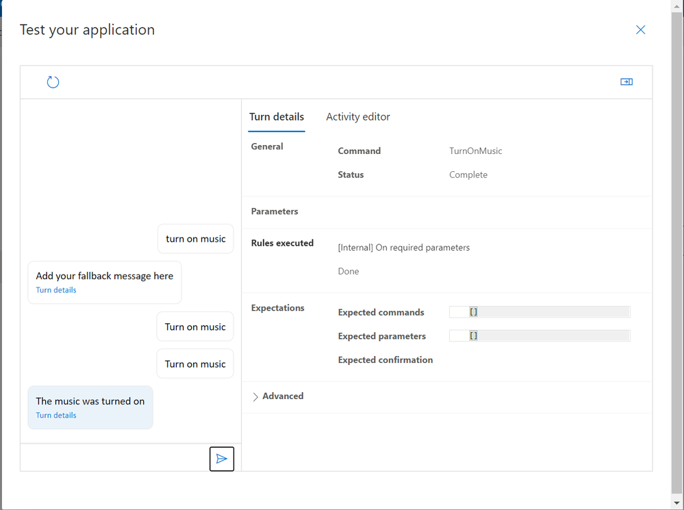 We’re now ready to try out our new command… If we type “Turn on music” in the entry box at the bottom of screen;