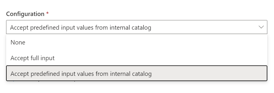 - “Accept predefined input values from internal catalog” – Constrain the parameter value that the user gives to a pre-defined list of allowed values.