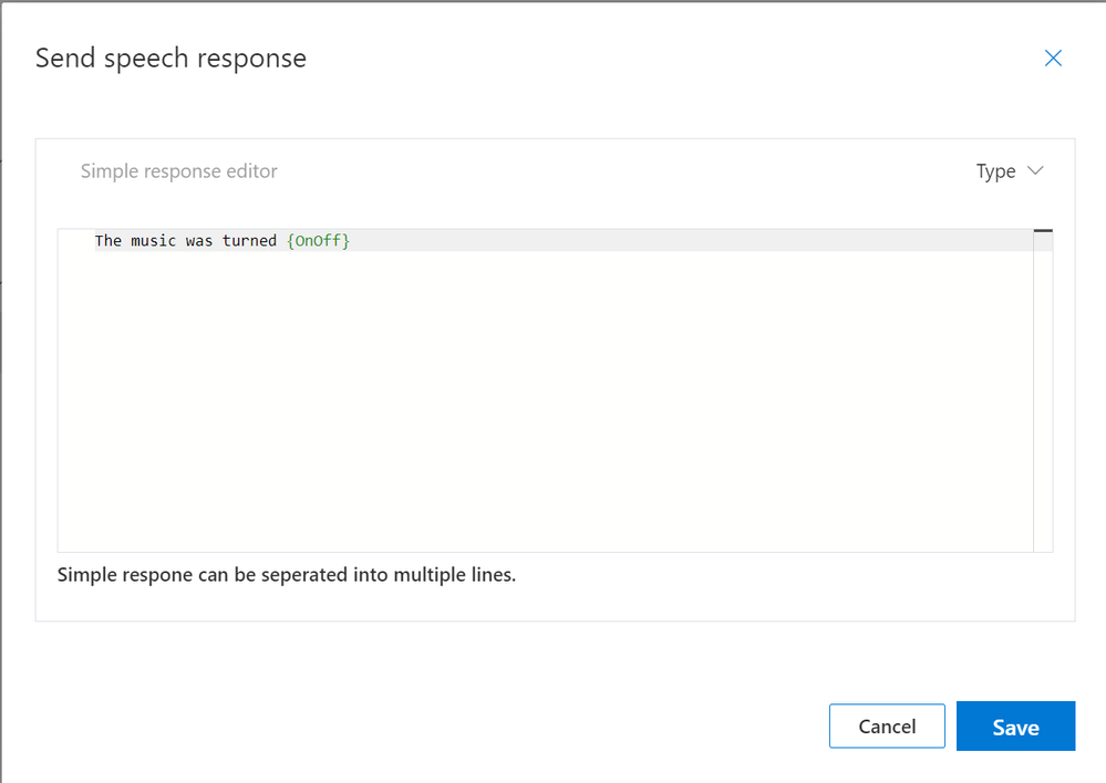 We’ll leave our response at the default of “Simple Response” and have the command respond with “The music was turned on”;
