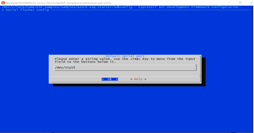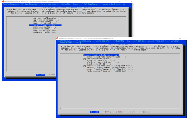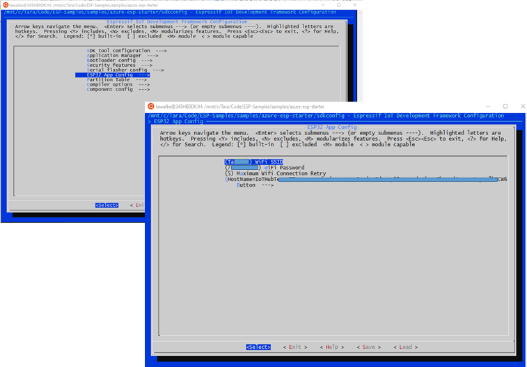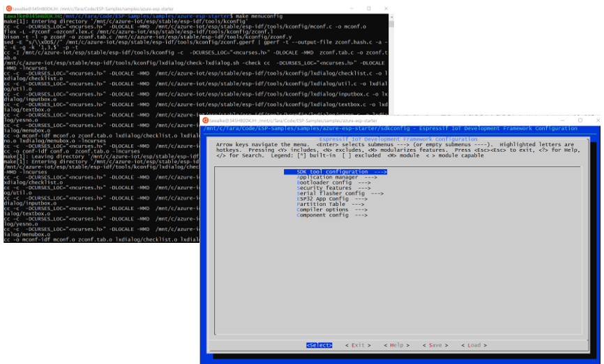 With the component copied, I will naviagate back to azure-esp-starter folder to configure and build this sample. To configure the sample I will run make menuconfig. If I choose to use Cmake instead of Make, I would run idf.py menuconfig.