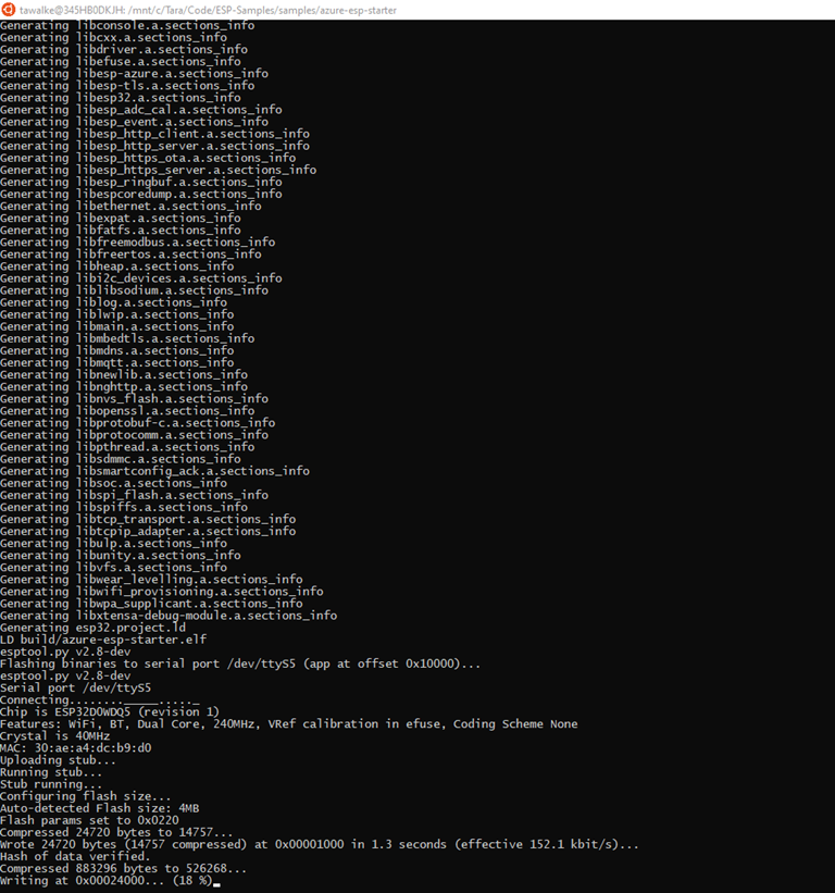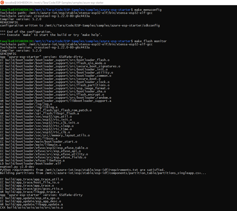 Once I Exit (and Exit again) the configuration is saved, and now comes the fun part; Building and Flashing to the ESP32 Azure board! To compile the code, build/link the binary and flash to the board usually I would run the command: make flash. But since I’m sharing the fun with you all reading this blog post, I will run the command: make flash monitor which will in addition to building and flashing, will show the log and information from the board coming across the serial port connection.
