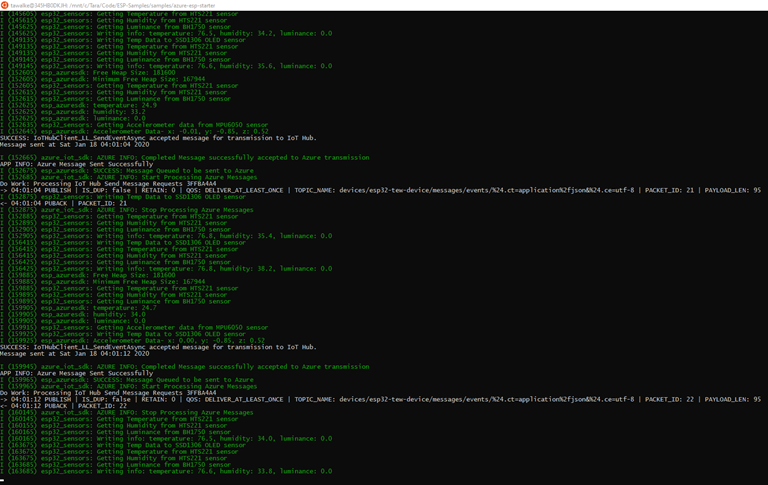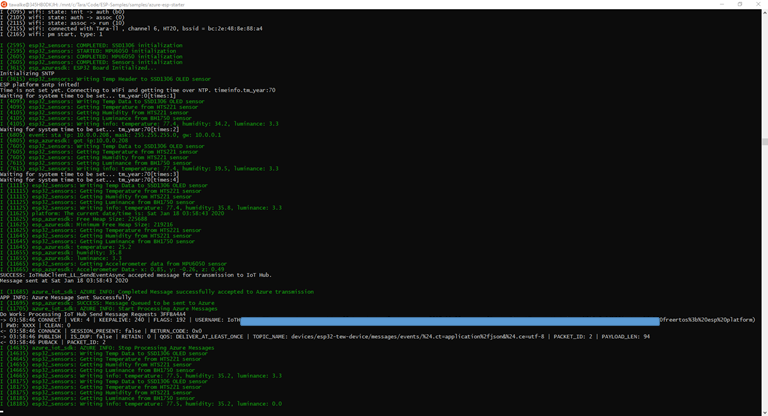 After successfully building and flashing code to the board, you will see on the console information about the data coming from the sensors and the confirmation of that data being written to Azure IoT.