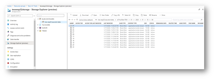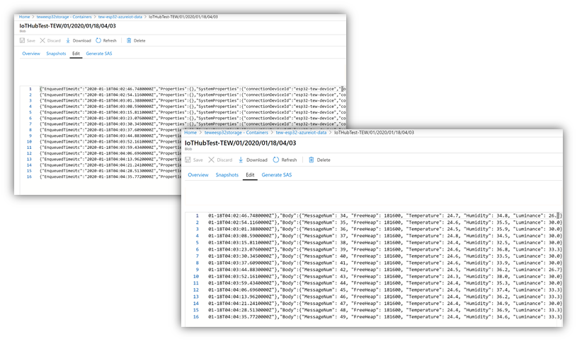 Finally here is a snapshot of the ESP32 sensor data being routed and stored in storage account within Azure.