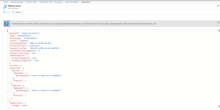 As shown below, this is my IoT Hub and a graphical representation of the messages being received from my ESP32 Azure IoT device, as well as, it’s device twin information.