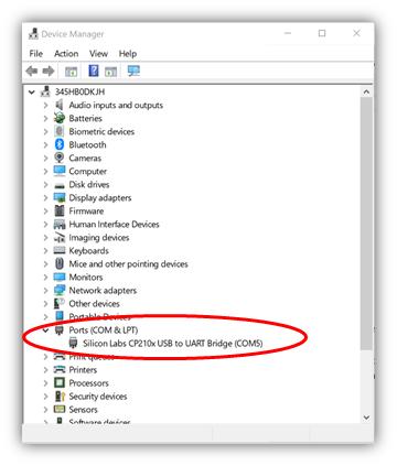 Since I’m on a Windows 10 machine, let’s go to Device Manager and find out what serial port the ESP32 device is connected on. In Device Manager, under Ports there will be an USB to UART virtual COM port driver shown, which the associated COM port the board is connected on. It’s key to take note of the connected port, as it will be essential later.