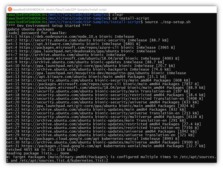 I’ve already cloned the repo and I have the Ubuntu distro of the Windows Subsystem for Linux on my machine. Given this, I just need to run the development setup script provided in the repo by going to the install-script folder and running source ./esp-setup.sh This script will update your WSL packages, install the ESP toolchain and development framework, as well as set the environment variables that are needed.