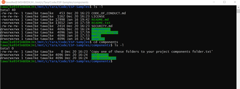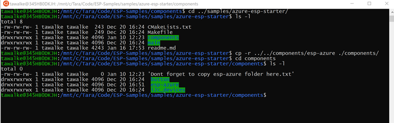 I’ll go with the esp-azure component so we can build the azure-esp-starter sample. I’ll navigate to the samples folder within the repo directory and going to that sample’s folder. Next I’ll copy the esp-azure component into the sample’s components directory. These are the same steps you would follow if you were building your own ESP application using the Azure IoT ESP component.