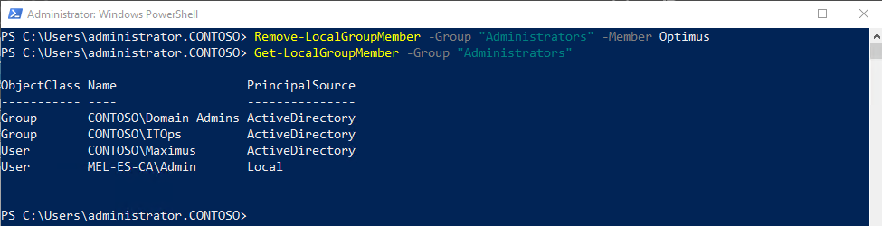 Remove-LocalGroupMember -Group “Administrators” -Member Optimus