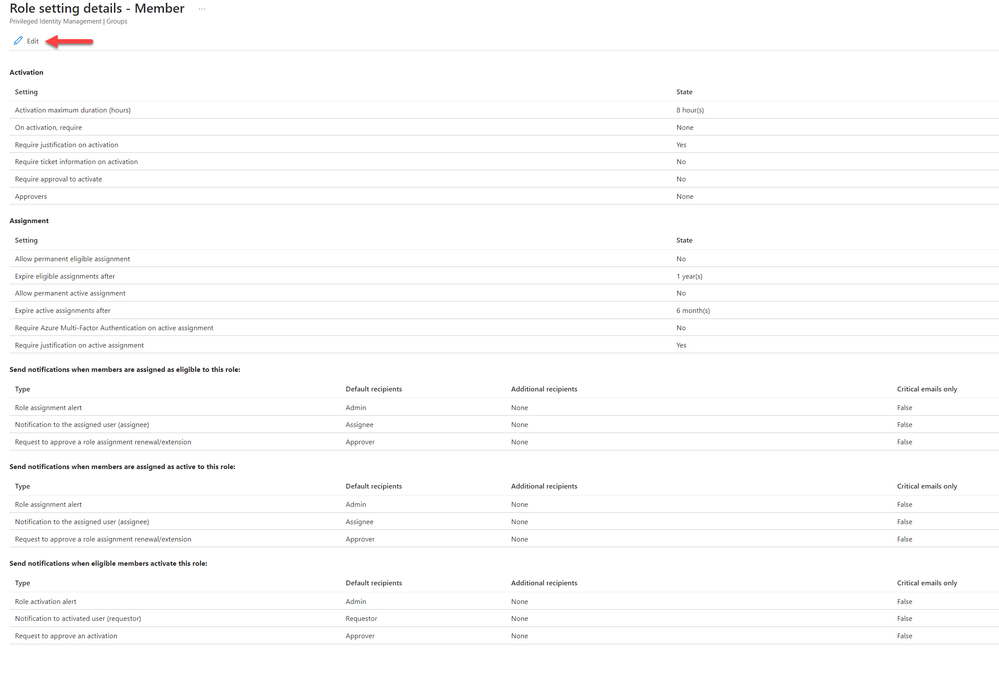 - From the Role list, select Member to access the PIM settings for the role. Then select Edit to modify the default settings.