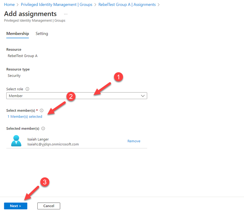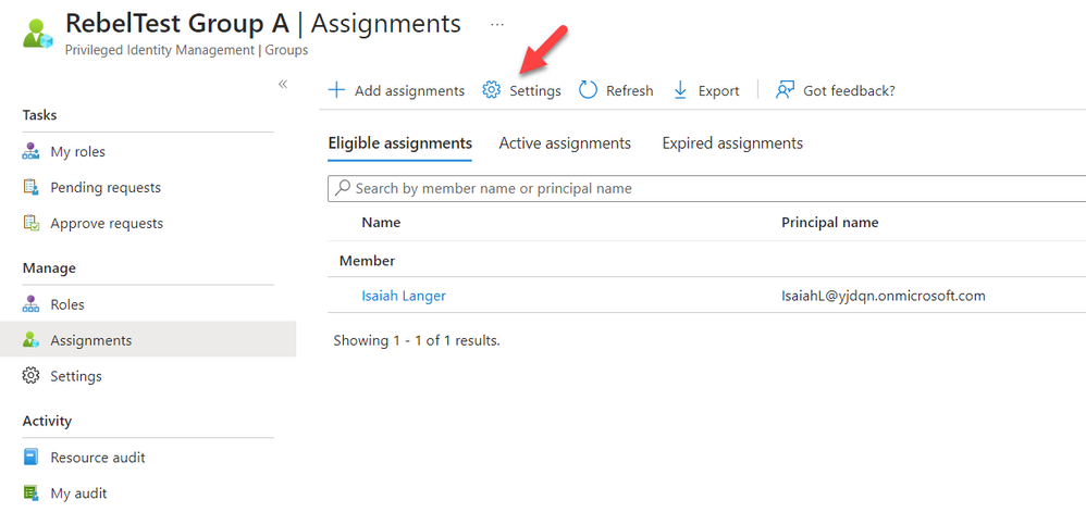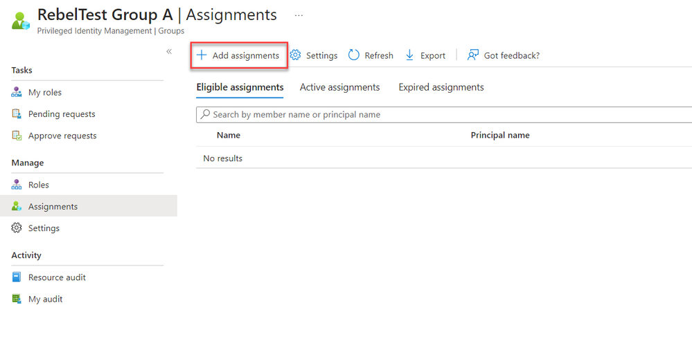 - To add a user as an eligible member to the group, select the group name, followed by Assignments in the group page.