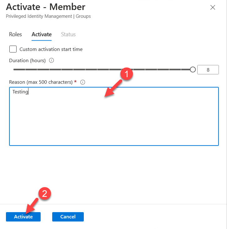 - In the role activation window, provide justification for the role request and select Activate.