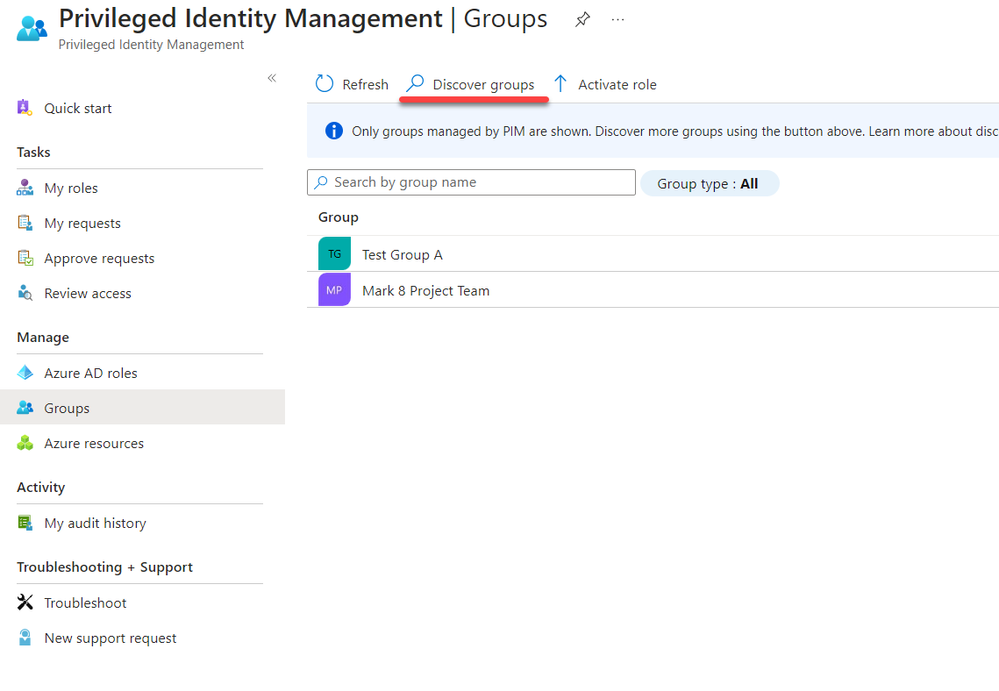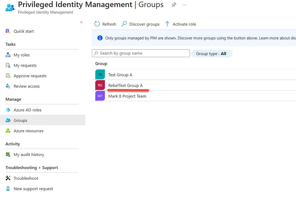 - Return to the Azure AD PIM groups page to observe the newly onboarded group.