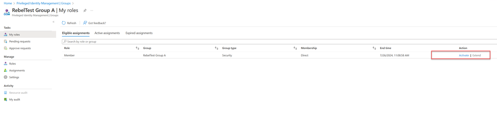 - Under My roles, locate the eligible member role for the security group and select Activate.