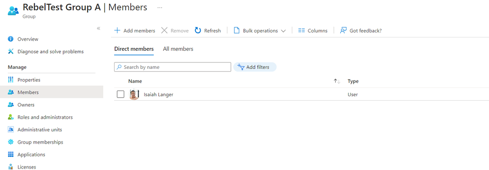 In my demo environment, I already have an Azure AD security group called “RebelTest Group A” and it doesn’t have any members assigned.