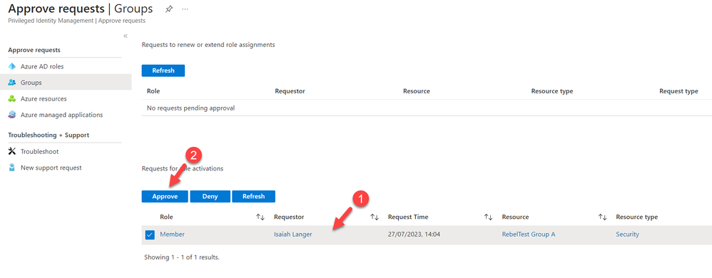- Select Groups and find the role activation request from Isaiah Langer in the list. Then select the user and click Approve.