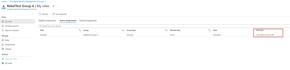 - Isaiah can also check his role activation status, which will display his account as under active assignment, along with the end time.