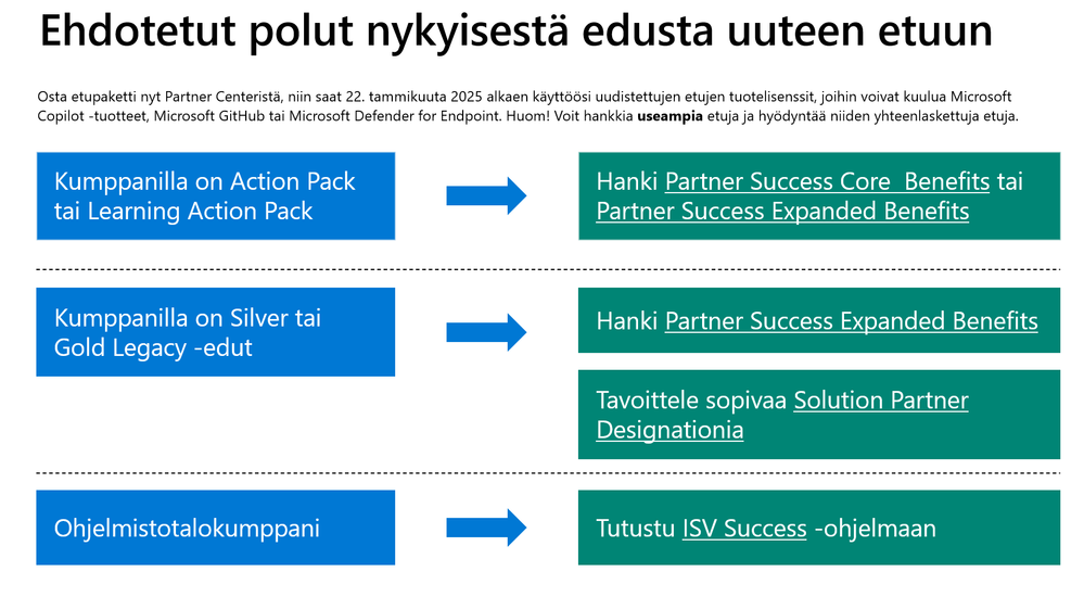 Partner Centeriin tulee 22.1.2025 paljon uusia tuote-etuja Solutions Partner -nimityksen omaaville kumppaneille.Microsoft lopettaa vanhojen etupakettien, kuten Microsoft Action Packin ja legacy silver/gold -etujen, myynnin 22. tammikuuta 2025 alkaen. Kumppanit, jotka ostavat tai uusivat nämä paketit ennen tätä päivämäärää, voivat käyttää etujaan 12 kuukautta osto- tai uusimispäivästä lähtien. Uudet etupaketit tarjoavat enemmän valinnanvaraa ja arvoa, ja ne sisältävät modernisoituja ohjelmistolisenssejä ja henkilökohtaista tukea.