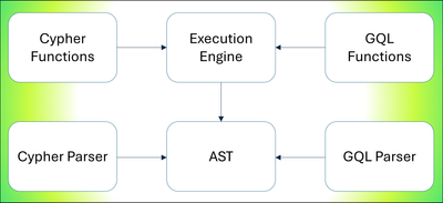 The diagram shows the dependencies within this new architecture, highlighting the separation and interaction between the components. The language-specific function modules for openCypher and GQL provide the functions to the execution engine. The language-specific parsers for openCypher and GQL produce an AST, and the execution engine operates on this AST. The engine only needs to understand this AST format, making it language-agnostic.