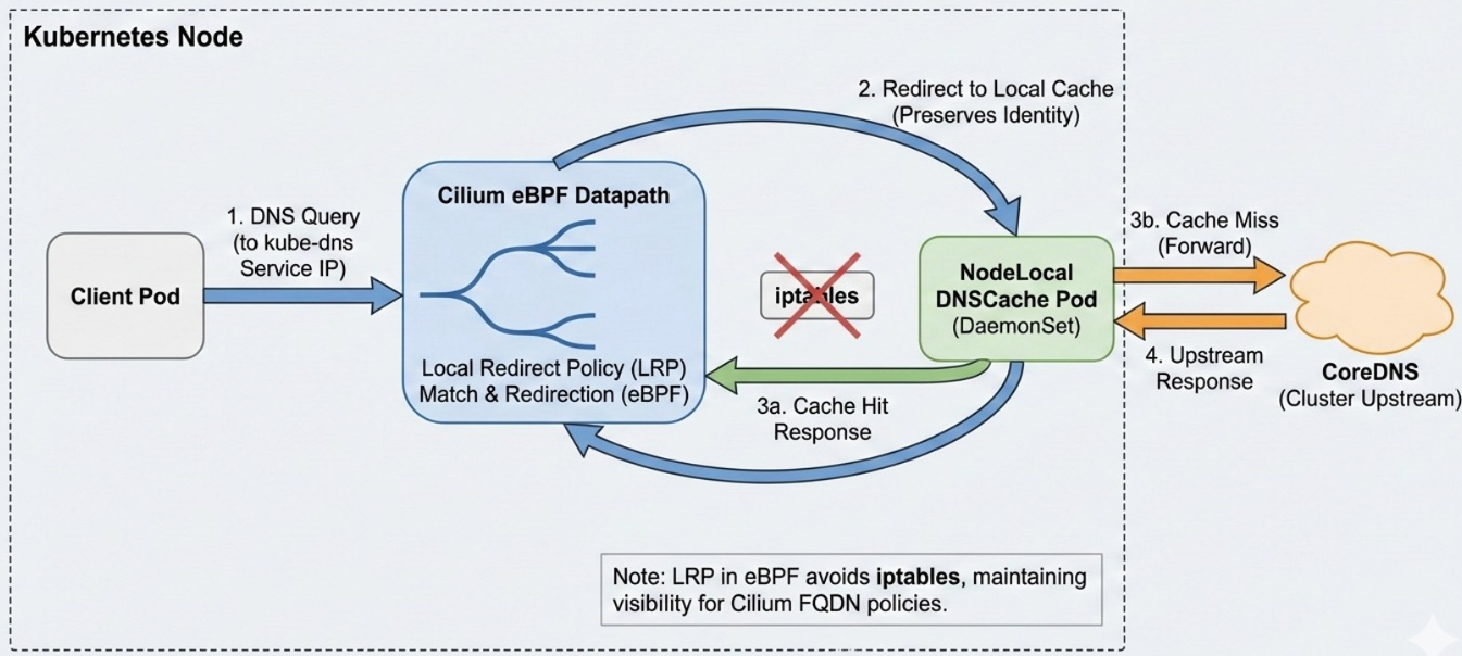 - Redirection: Cilium LRP intercepts traffic to the kube-dns Service IP and redirects it to the local pod on the same node.
