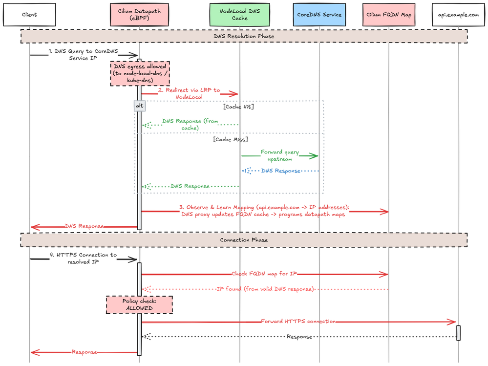 The diagram below illustrates how Cilium enforces FQDN-based egress policies using DNS observation and datapath programming. During the DNS resolution phase, queries are redirected to NodeLocal DNS (or CoreDNS), where responses are observed and used to populate Cilium’s FQDN-to-IP cache. Cilium then programs these mappings into eBPF maps in the datapath. In the connection phase, when the client initiates an HTTPS connection to the resolved IP, the datapath checks the IP against the learned FQDN map and applies the policy decision before allowing or denying the connection.