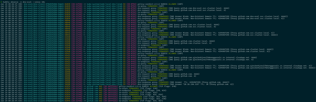 After adding matchLabels: k8s:k8s-app: node-local-dns, the traffic is now allowed. Hubble confirms a policy verdict of EGRESS ALLOWED for UDP traffic on port 53. Because DNS resolution now succeeds, the response populates the Cilium FQDN cache, subsequently allowing the TCP traffic to github.com on port 443 as intended.