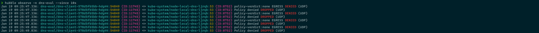 When inspecting the traffic flows, you will see EGRESS DENIED verdicts. Crucially, notice the destination pod in the logs below: kube-system/node-local-dns, not kube-dns.