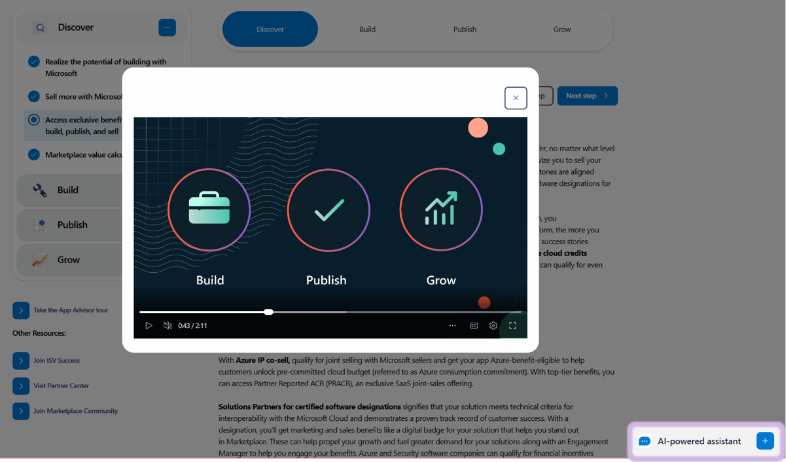 Receive personalized guidance based on your ISV Success or Marketplace Rewards membership. App Advisor adapts its recommendations to help you make faster, smarter decisions.