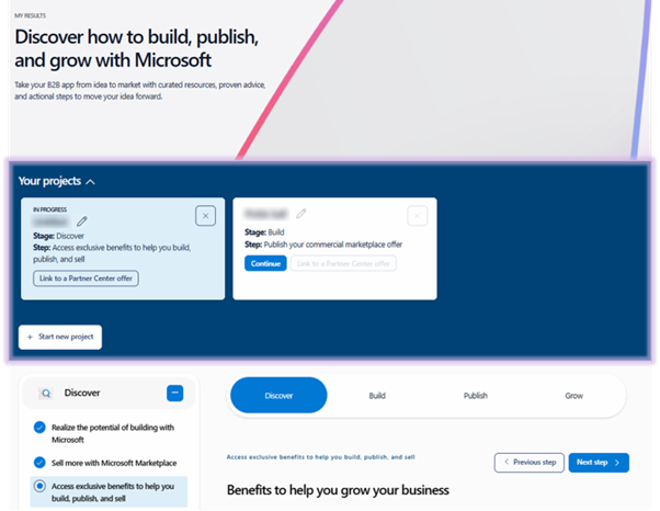 Advance multiple apps and agents from a single, centralized experience. Save guidance across projects and link each to its Partner Center offer for seamless continuity.