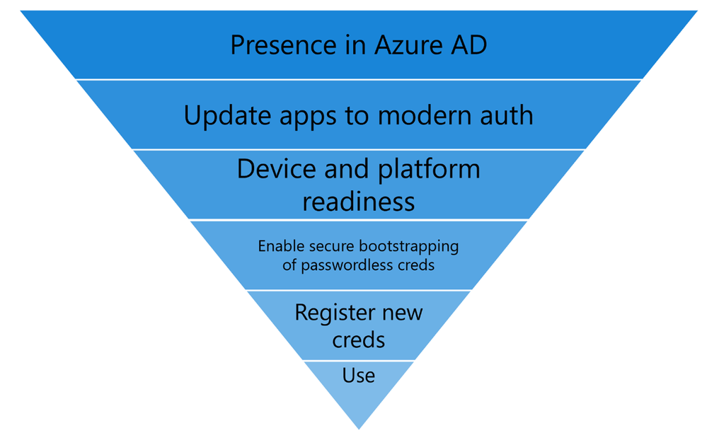 I am here to share more about the journeys that some of our most successful passwordless customers, including Microsoft ourselves, have taken, and what we have learned from them. The first step on the journey is to understand and start planning for the “Passwordless Funnel” as illustrated in the image below: