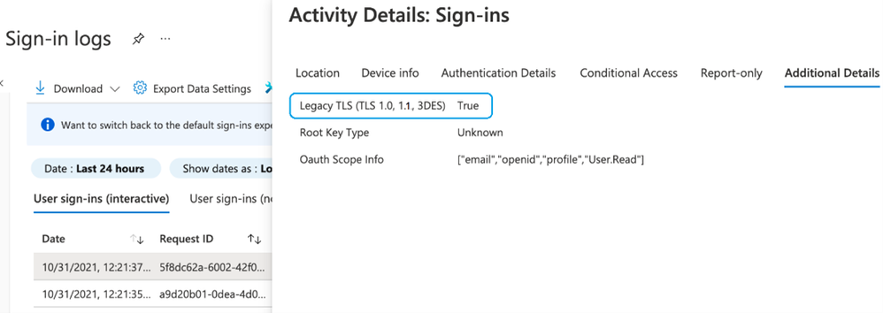 For complete guidance on supporting TLS 1.2 with Azure AD, refer to our documentation. Customers can use Azure AD sign-in logs to help identify clients or apps still using legacy TLS in their environment. For sign-ins performed over Legacy TLS, Azure AD will mark the Legacy TLS field in additional details with True. The Legacy TLS field appears only if the sign-in occurred over Legacy TLS, so if customers don’t see any Legacy TLS in their logs, they are ready for the switch to TLS 1.2.