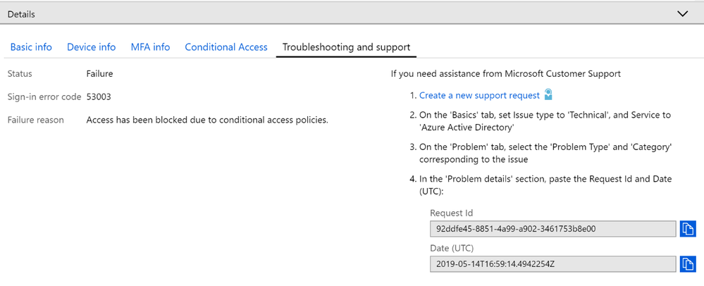 Once you look into the sign-ins logs, you will find important information such as the user, application, device, multi-factor authentication (MFA), and conditional access status per sign-in. To speed up investigations, we collect all information needed in case you open a support ticket.