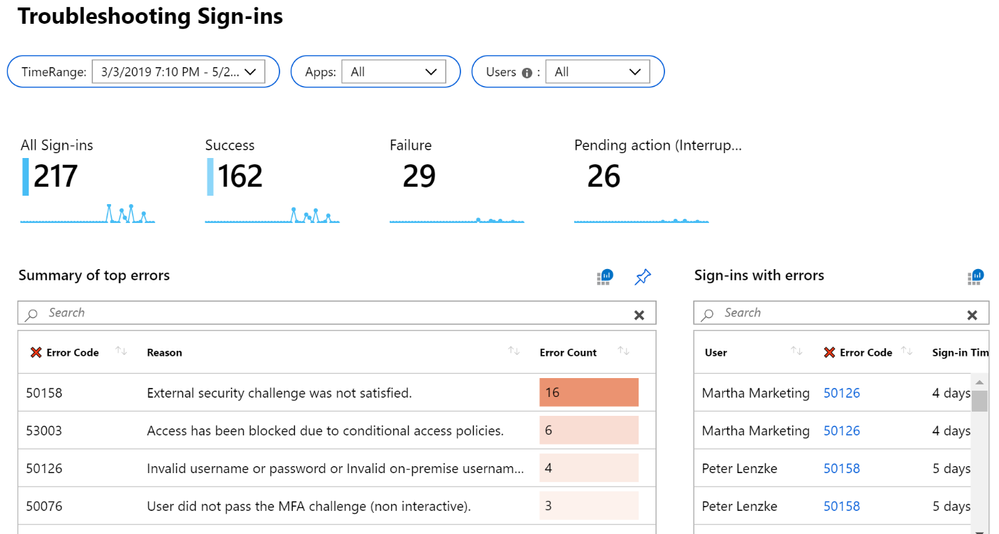 Be aware that federated user sign-ins, which fail at the federation server (ADFS) level and never reach Azure AD, will not show up in the logs today.
